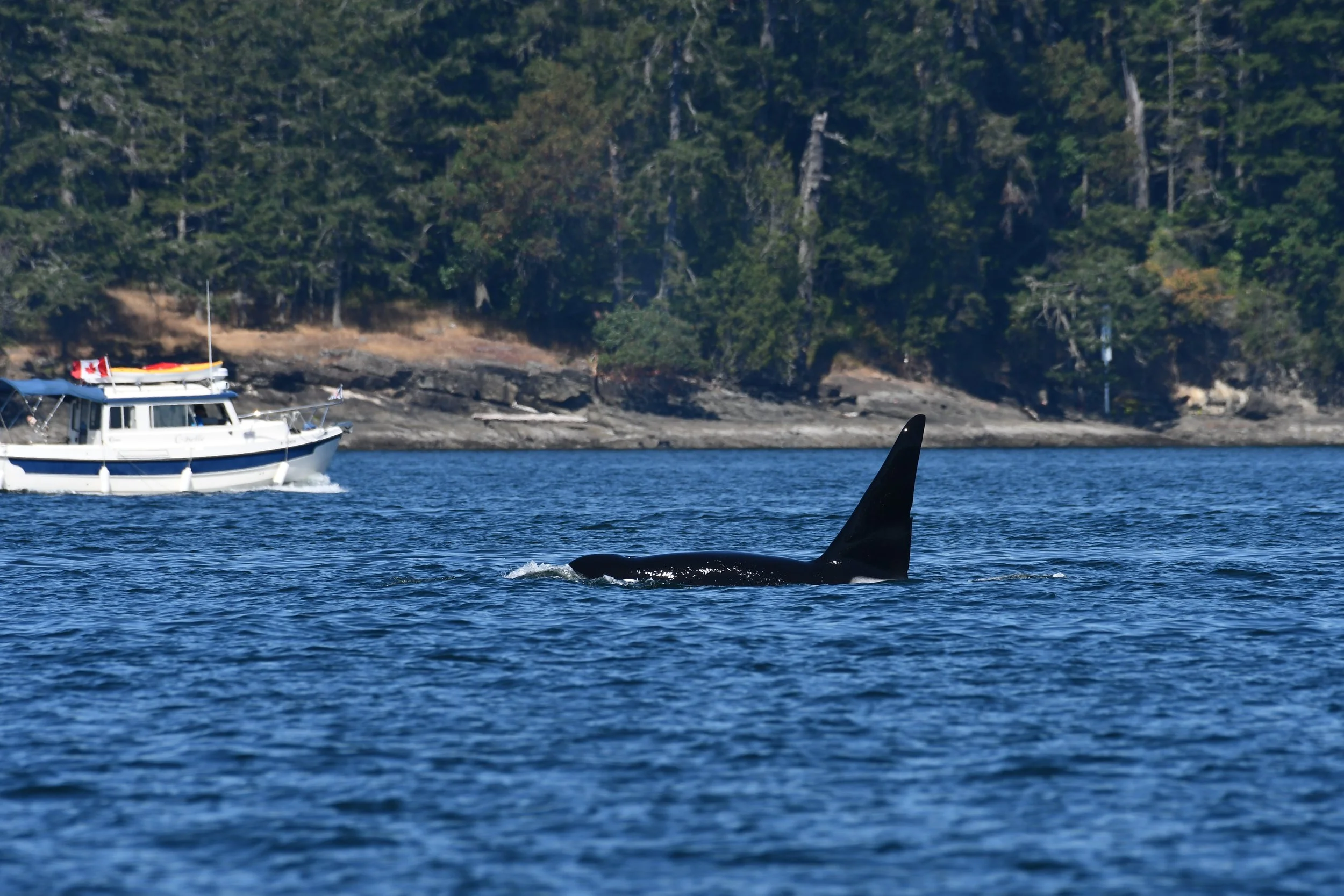 On July 29, when we headed out on the water, our thermal imaging cameras in Swanson Channel alerted us to killer whales travelling North. We routed in their direction and quickly found them with pleasure-crafts following. The whales were travelling North and then flipped South, slowly making their way to Satellite channel and further South. These whales were the T046s and T122. Since these whales had no whale watchers following them, we left in an attempt to allow them a peaceful day, which was wishful thinking as two vessels soon located them. With straitwatch on the scene, we continued our departure.