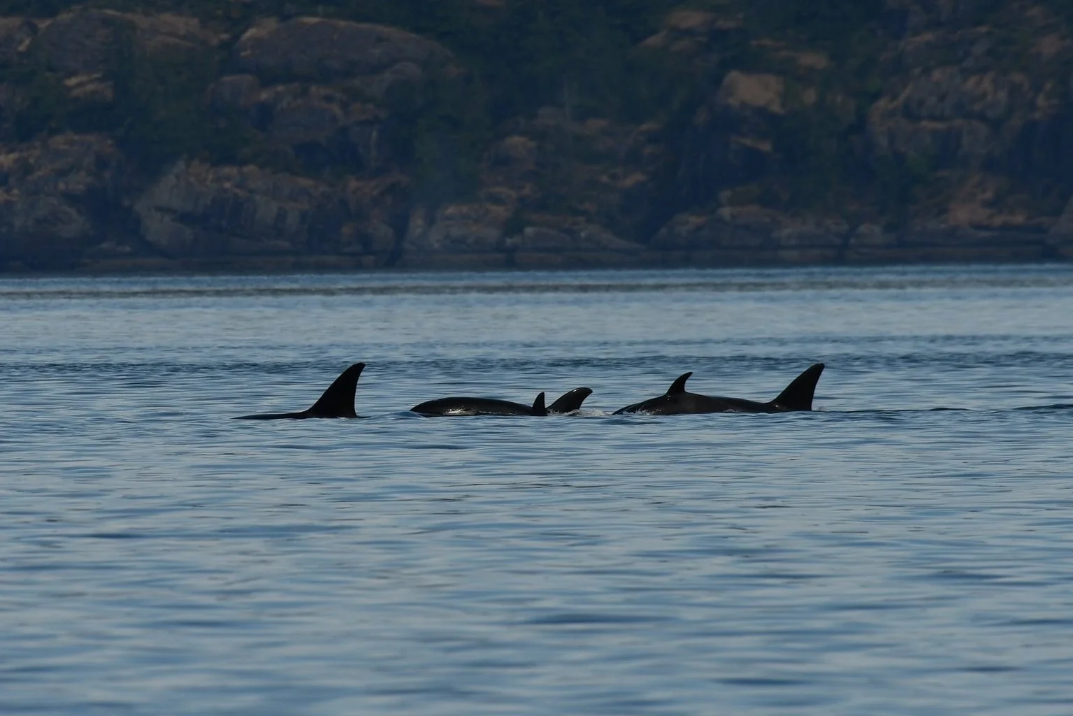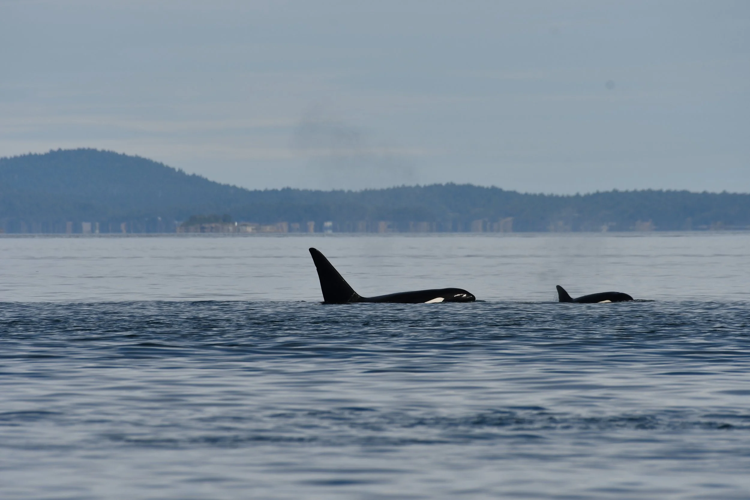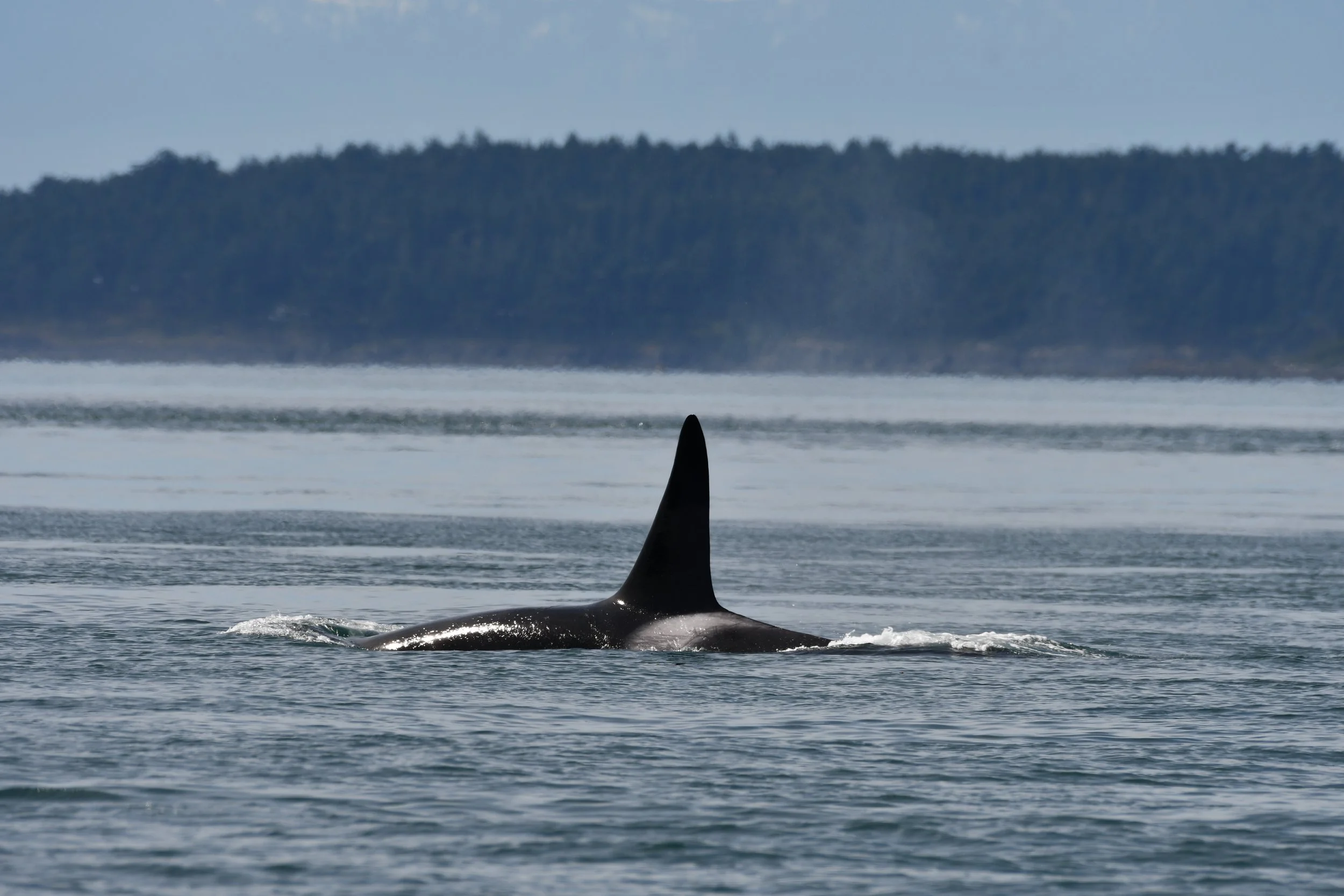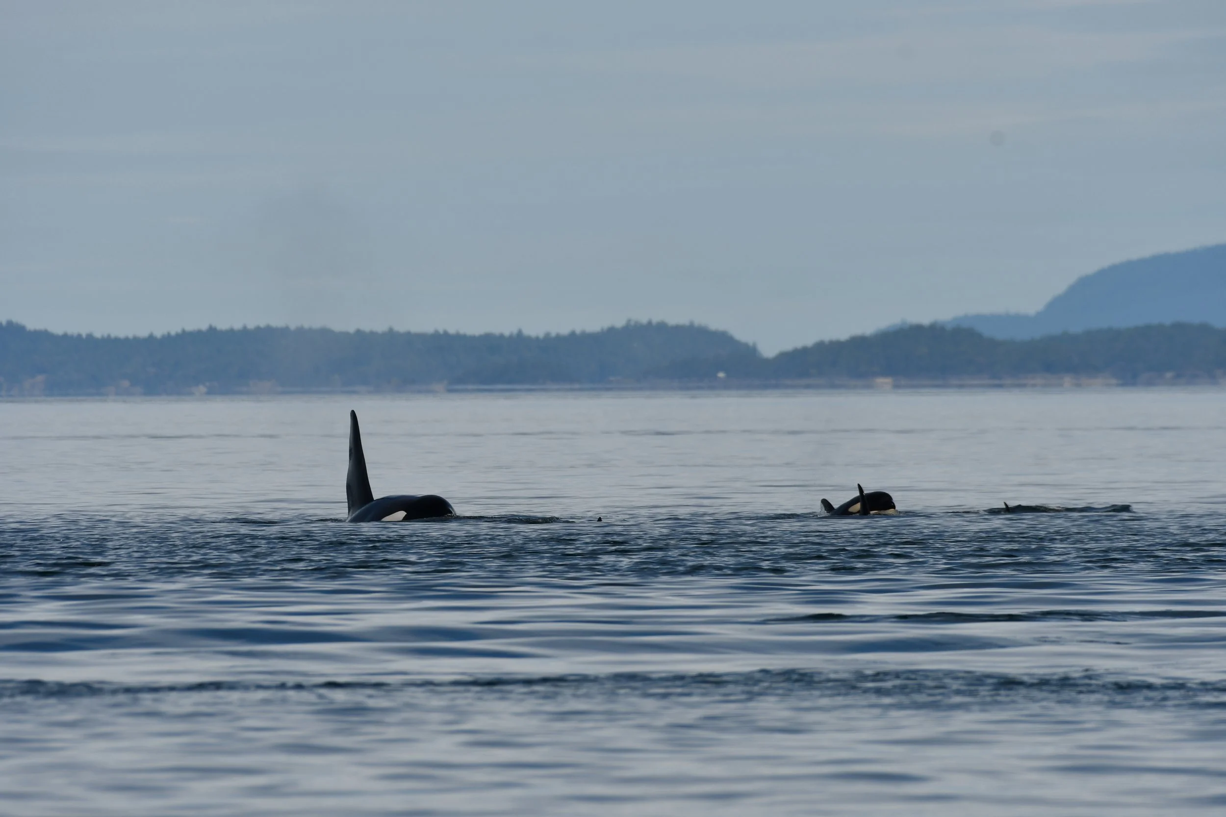 On May 27, 2025 our team set out in the morning with a report of a large group of killer whales in Boundary Pass. Often this means SRKW are around, but today was different. Soon enough, we were within sight of a group of approximately 20 Bigg’s killer whales! This is the largest group of Bigg’s our team has seen. Unlike SRKW who usually travel in large groups of 15-70, Bigg’s stay in smaller pods, usually ~2-8 individuals. On this day, there were members of at least 5 different pods! We’ve determined these pods are the T123s, T101s, T100Bs, T100E, and T086As. Large groups of Bigg’s killer whales are often referred to as T-Parties(!) due to their previous common name “Transient”. This large group was moving slowly, taking the tide rip back and forth north of ŚÁ,NES (Turn Point, Stuart Island). We were the only vessel with them at first, and with our engines off, we drifted with the current and kept the underwater soundscape quiet.