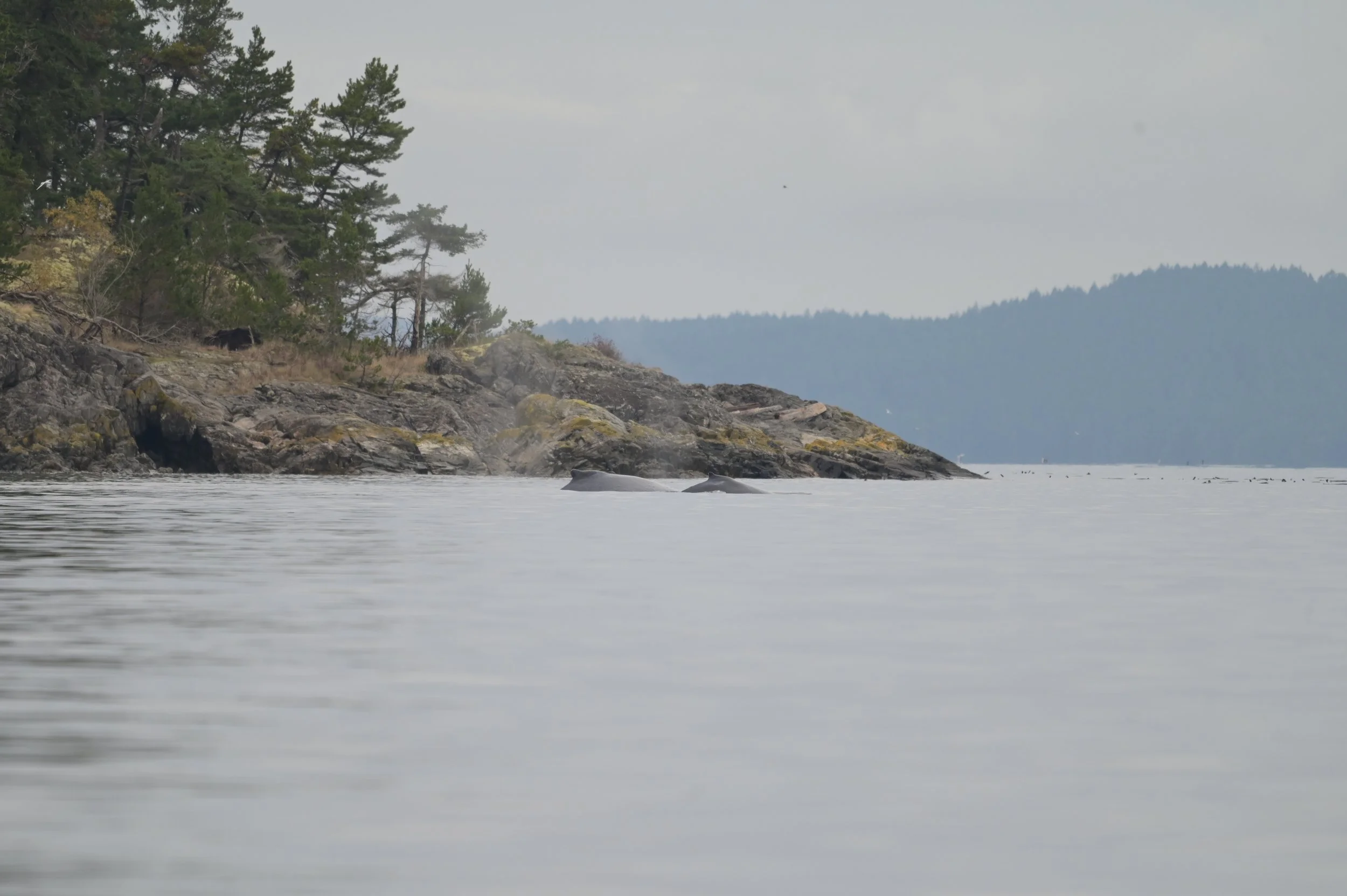 On November 14th our team went out to monitor our zone 2 area, South of Turn Point. After observing different clusters of birds gathering around the bait balls, we received reports of potential Humpbacks in the area so we got the camera gear ready and kept our eyes open. After a few minutes in Haro Strait we noticed some splashing a few kms away off of ȽO,LEĆEN (Moresby Isl.), the humpbacks were travelling at a faster pace so we shut the engines down to let them pass, once they passed we attempted to capture the fluke ID from behind but no luck as the whales continued on their journey. After 20 minutes of watching the humpbacks slowly disappear in the distance our team packed up for the day.