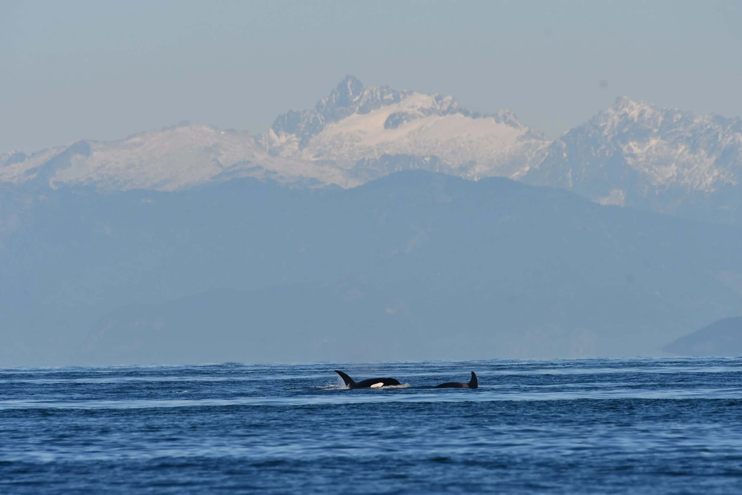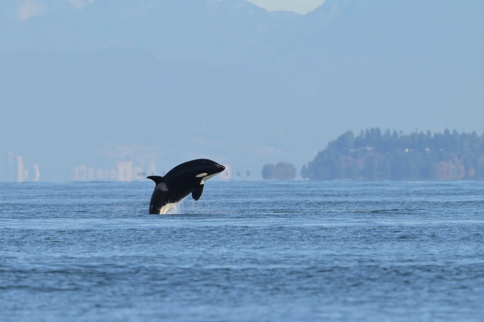 After counting pinnipeds on multiple haul outs, we headed North in the Strait of Georgia towards Active Pass. On the way there, we encountered a group of Bigg’s KELȽOLEMEĆEN (killer whales). These KELȽOLEMEĆEN were foraging and surface active, tail slapping and breaching in celebration of their hunt. After taking identification photos, we left these KELȽOLEMEĆEN who were then bombarded by whale watching vessels from the mainland. These KELȽOLEMEĆEN have been identified as the T035As and members of the T100s.