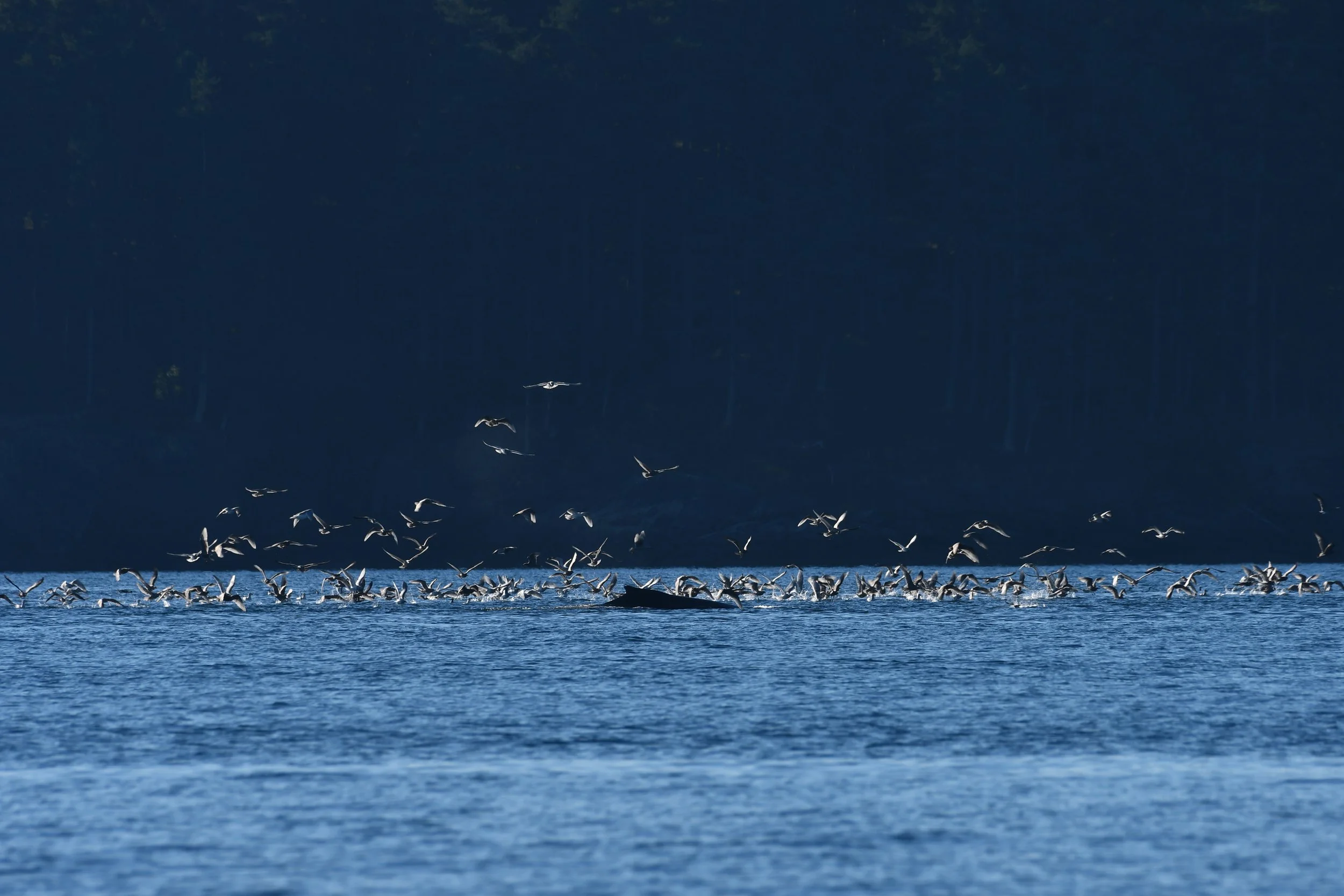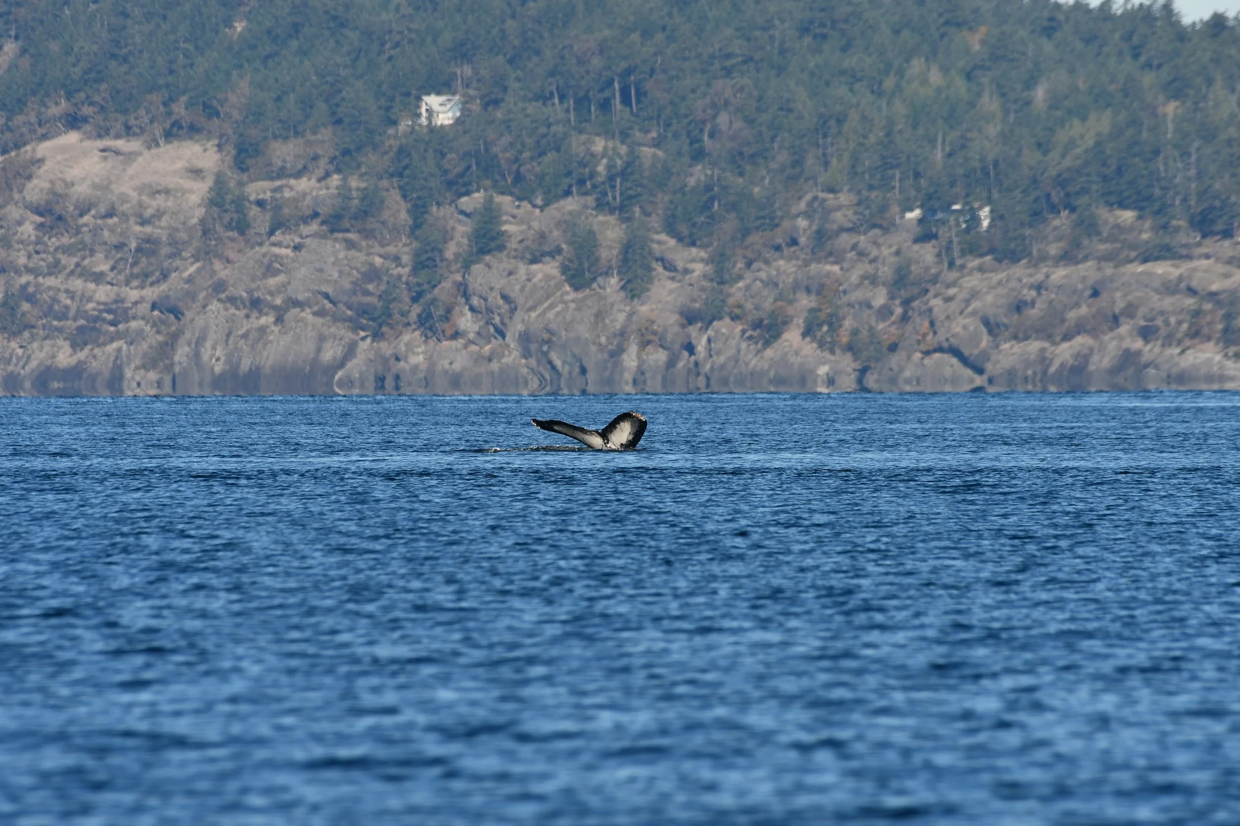 As recreational boating and commercial whale watching decreases into the Autumn, our days on the water are far more calm. On October 14, our team set out from the marina to complete our pinniped haul out monitoring in our monitoring zone 1. As we headed towards Blunden isl., we came across a juvenile ḰENES (Humpback Whale) that was crossing Boundary Pass. This young whale was foraging in bait balls news Stuart Island. We obtained identification photos and left them alone to feed in peace. This ḰENES has been identified as BCZ0408’s 2023 calf.