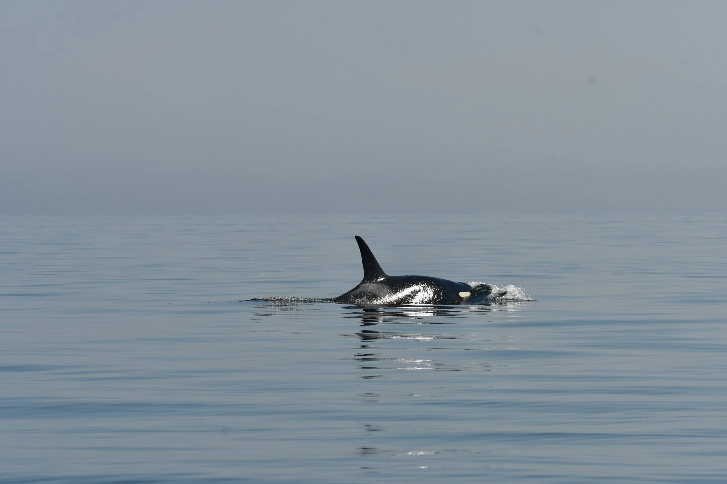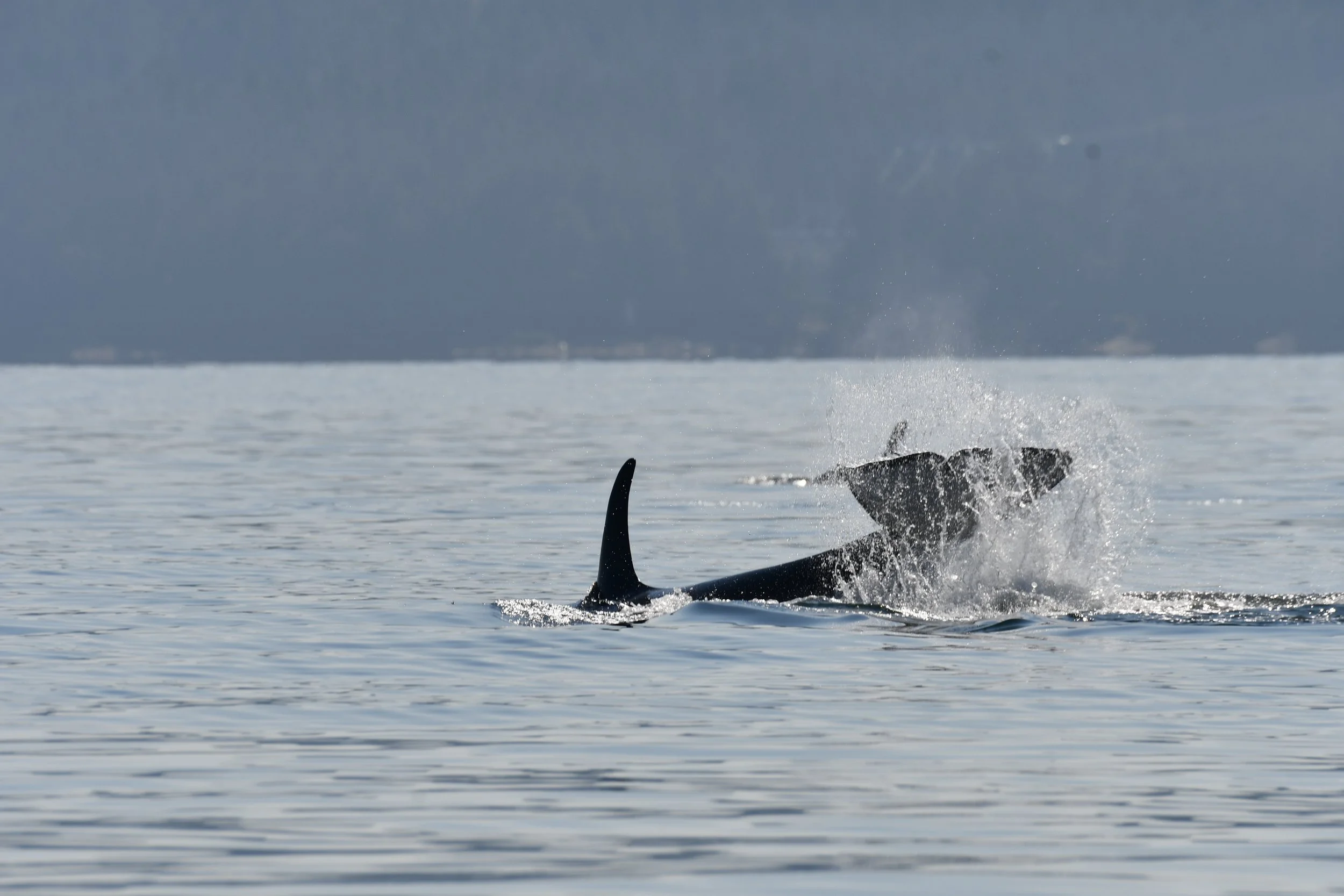 On September 23 we received notification of the Southern Residents heading south off of Gabriola Island near Nanaimo and set out to locate them. On our way, we encountered 6 humpbacks whales in the strait of georgia, some of these the same whales we saw the day before, with a couple additions. These whales were not identified as we observed them approximately 7km away. We left the humpbacks and continued north up the side of Galiano and came across SRKW near Cook Cove. Promptly we cut our engines, deployed our hydrophone, and set ourselves up to collect photo identification and video. The whales were vocalizing loudly, travelling quickly with little surface activity, and very spread out. When all of J pod passed us, we packed up our gear and slowly travelled behind them until they reached active pass, and then we left them to be as we headed south through Active pass and the whales continued in the Strait of Georgia. We attempted to hail two vessels to alert them of the whales’ presence, and to our pleasure saw a large group of people watching the whales from the shore of Galiano Island.